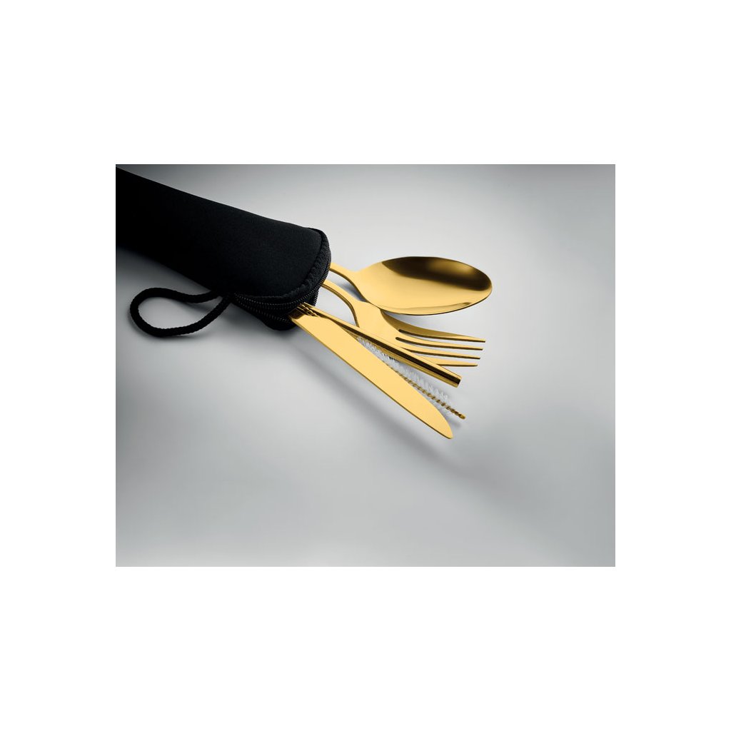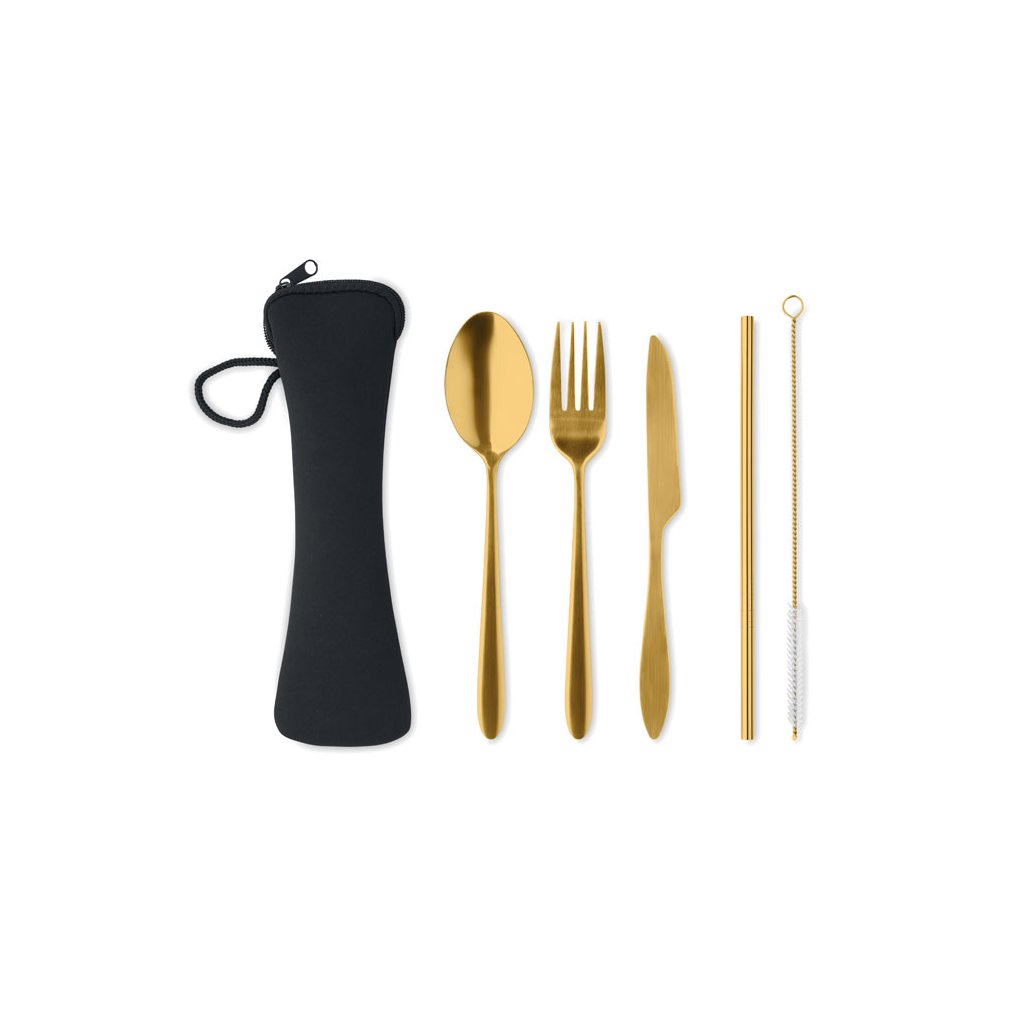 Táto sada obsahuje vidličku, nôž, lyžicu, slamku a kefku na čistenie slamky.
