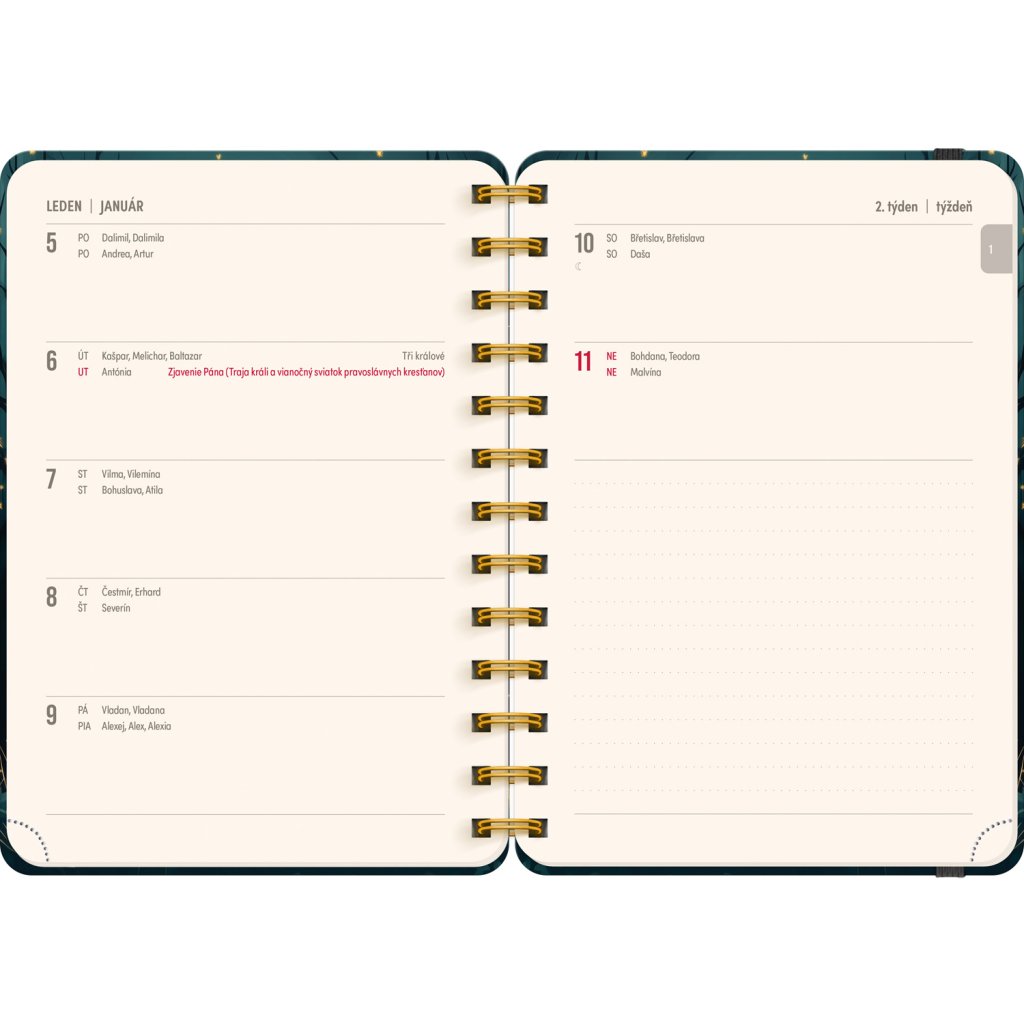 česko-slovenské týždenné riadkové kalendárium s menami a sviatkami a priestor na poznámky.