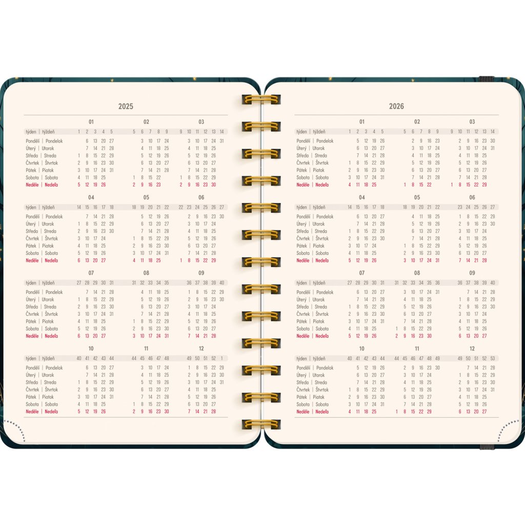 Osemnásťmesačný diár obsahuje prehľad na rok 2025 a 2026,