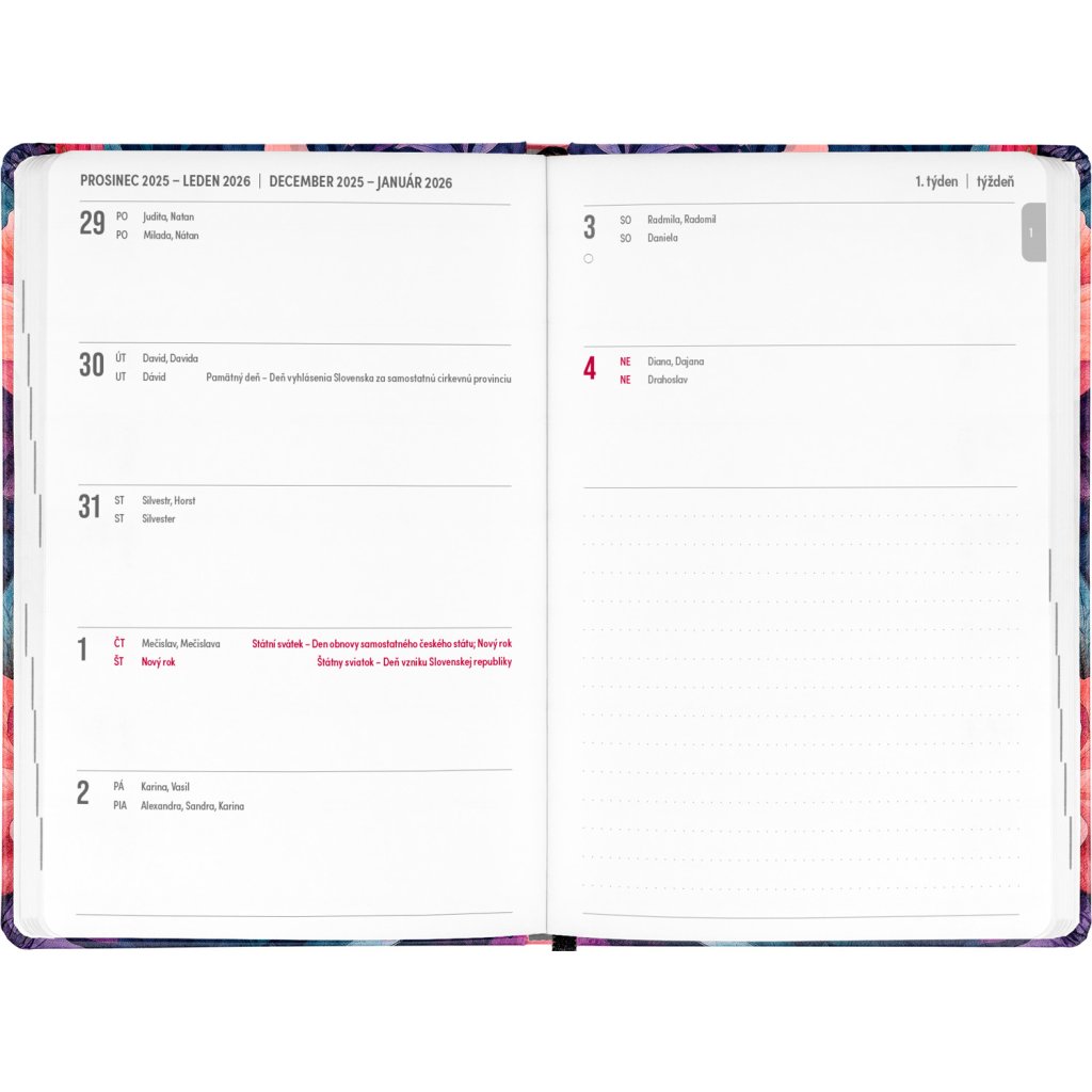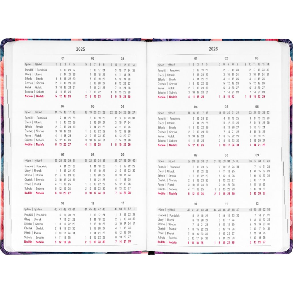 Osemnásťmesačný diár obsahuje prehľad na rok 2025 a 2026,
