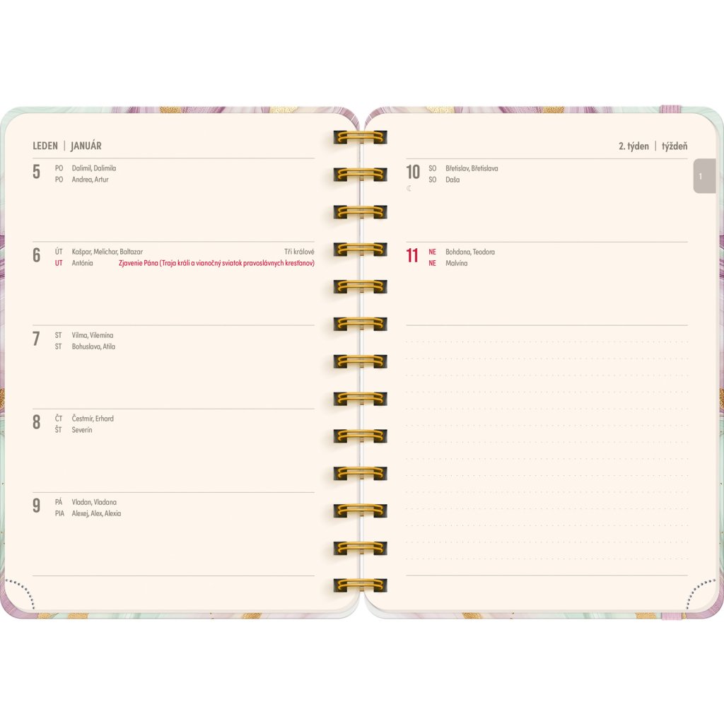 česko-slovenské týždenné riadkové kalendárium s menami a sviatkami a priestor na poznámky.