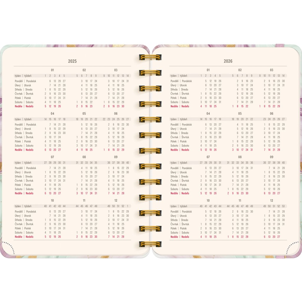 Osemnásťmesačný diár obsahuje prehľad na rok 2025 a 2026,