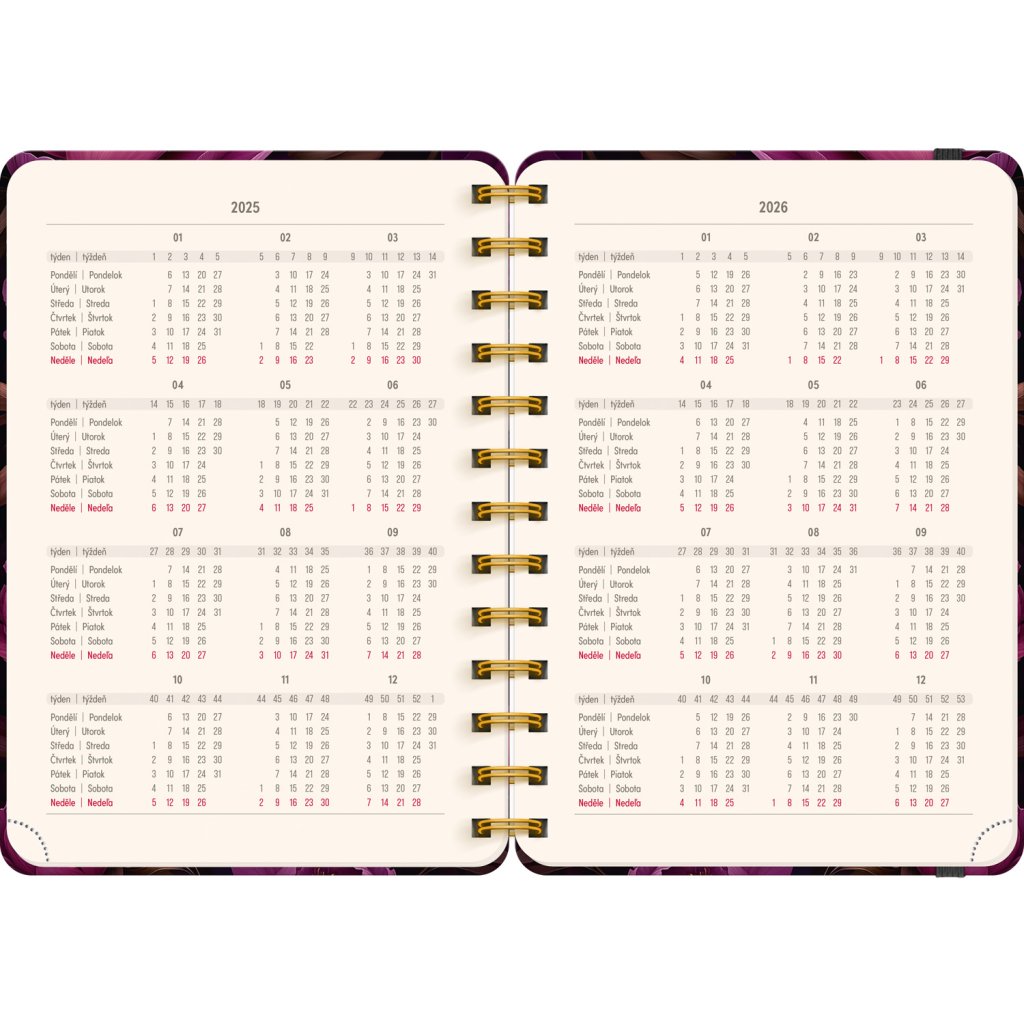 Osemnásťmesačný diár obsahuje prehľad na rok 2025 a 2026,