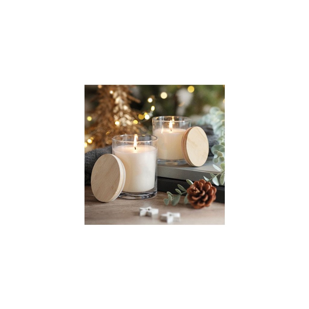 Vosková sviečka s vôňou vanilky v skle s bambusovým viečkom.
